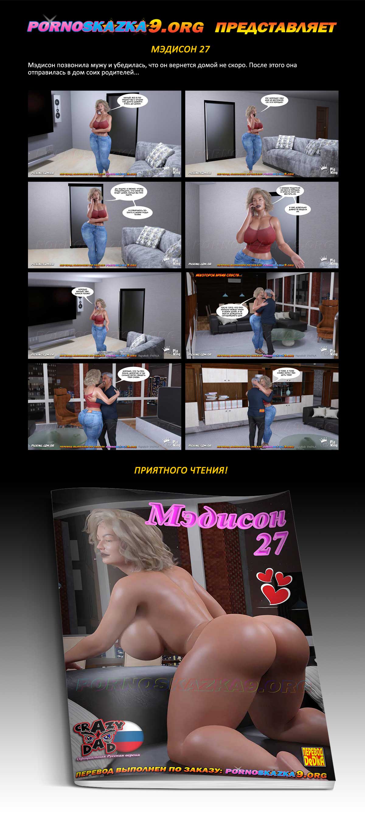 Порно комикс «Мэдисон. Часть 27». Мэдисон позвонила мужу и убедилась, что он вернется домой не скоро. После этого она отправилась в дом своих родителей…